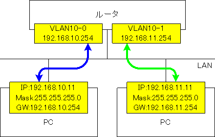 なお、192.168.10.** と 192.168.11.** は物理的には一つのLAN上にあるが、この間のトラフィックはルータが中継することとなる。