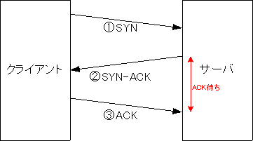 SYNアタック (SYN Flood)では、このプロトコルを悪用し、クライアントが(3)のACK応答を返さないようにして、サーバのACK待ちの状態を作りだすことによる攻撃手法である。