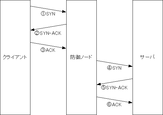 - 防御ノードはSYNパケットをサーバに転送せず、クライアントに対してサーバの代理となってSYN-ACKパケットを返送する。